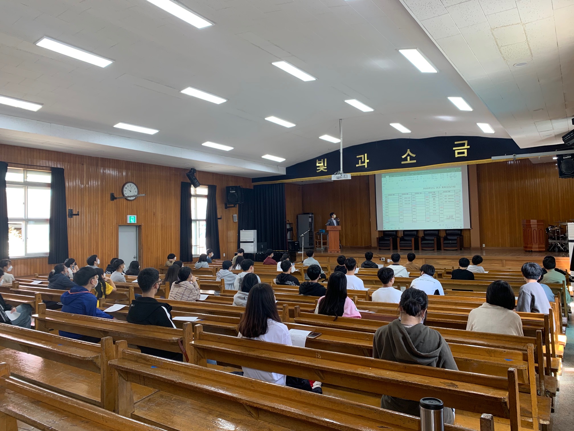 두 개 학급씩 순차적으로 강당에 모여 모임을 진행하였습니다.